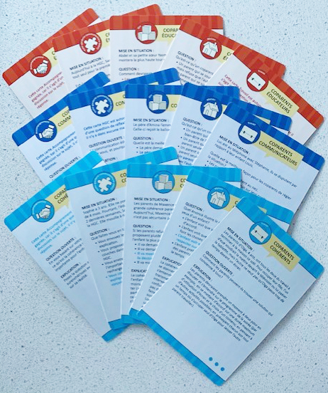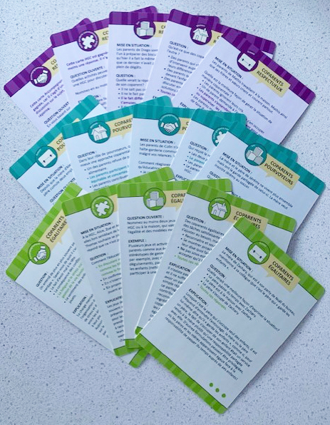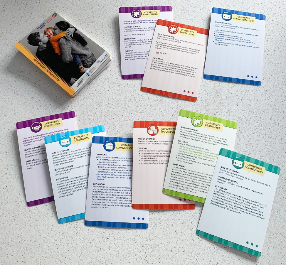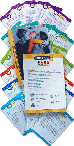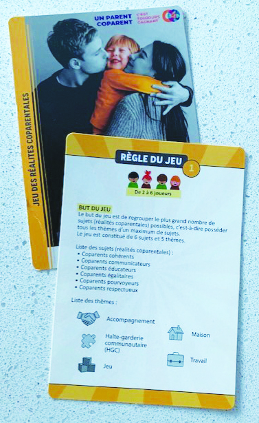 It is a fun learning tool, created with aim of transmitting the notions of coparenting in a friendly way around a coffee for example or a discussion workshop. The objective of this game is to bring together as many topics (coparenting realities) as possible.