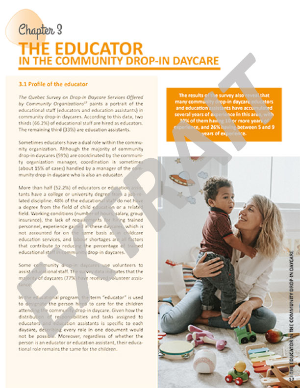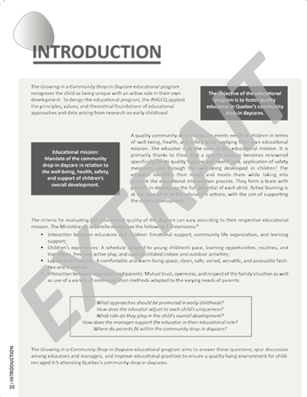 3rd edition of the educational program.The objective of the Education Program is to promote the educational quality of Quebec’s community drop-in daycares. It informs educators and managers with the aim of supporting them, feeding their thoughts and improving educational practices to ensure a quality living environment for children aged 0-5 who attend community drop-in daycares.