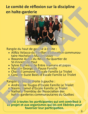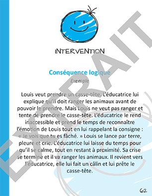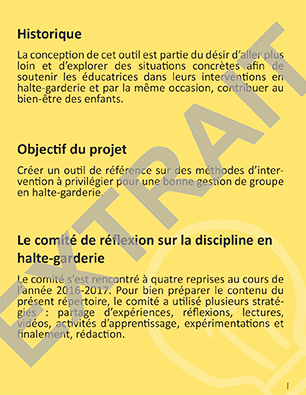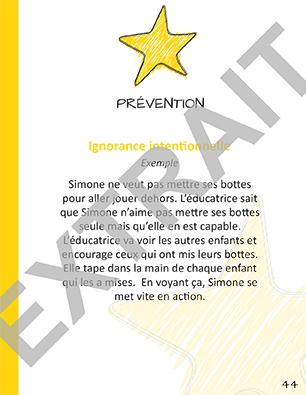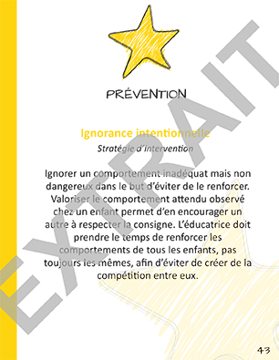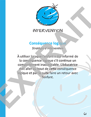 Comprend plusieurs stratégies d’intervention, divisées en 3 catégories : relation, prévention, intervention. Il est sous forme de fiches détachables et a pour objectif d’outiller les éducatrices dans l’adoption d’interventions démocratiques et bienveillantes envers l’enfant.
